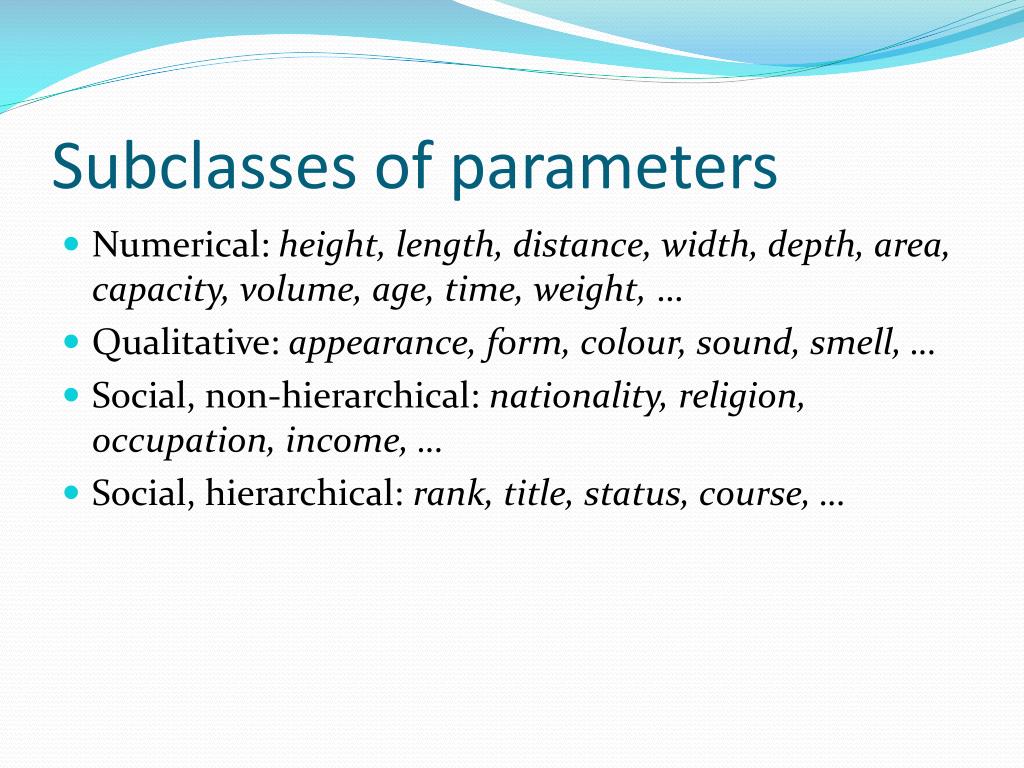 Subclasses of parameters • Numerical: height, length, distance, width, depth, area, capacity, volume, age, time, weight, … • Qualitative: appearance, form, colour, sound, smell, … • Social, non-hierarchical: nationality, religion, occupation, income, … • Social, hierarchical: rank, title, status, course, …