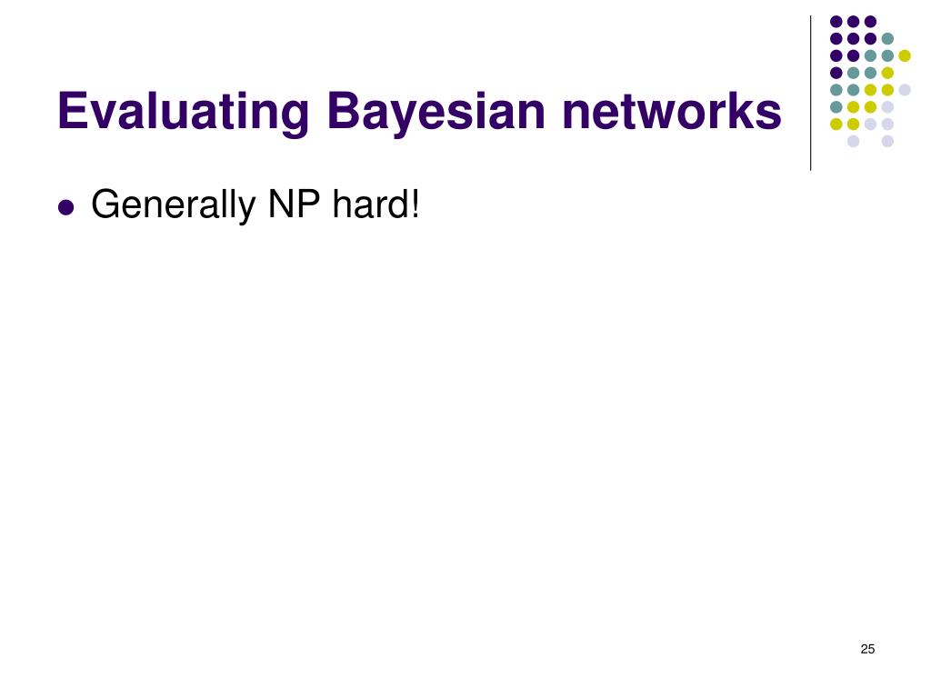 Order of reduction of required numbers Complete specification of probability distribution of n binary random variables needs 2n – 1 joint probabilities (jp). So for our example, 31 jp would be needed. But BN independence assumptions can reduce this to just 10 jp (listed on slide 19).