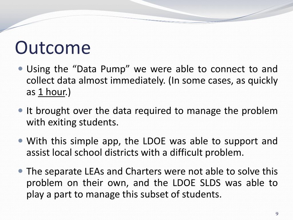 Outcome • Using the “Data Pump” we were able to connect to and collect data almost immediately. (In some cases, as quickly as 1 hour.) • It brought over the data required to manage the problem with exiting students. • With this simple app, the LDOE was able to support and assist local school districts with a difficult problem. • The separate LEAsand Charters were not able to solve this problem on their own, and the LDOE SLDS was able to play a part to manage this subset of students.
