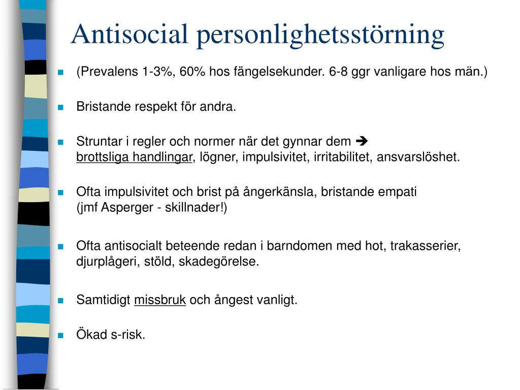 Antisocial personlighetsstörning • (Prevalens 1-3%, 60% hos fängelsekunder. 6-8 ggr vanligare hos män.) • Bristande respekt för andra. • Struntar i regler och normer när det gynnar dem brottsliga handlingar, lögner, impulsivitet, irritabilitet, ansvarslöshet. • Ofta impulsivitet och brist på ångerkänsla, bristande empati (jmf Asperger - skillnader!) • Ofta antisocialt beteende redan i barndomen med hot, trakasserier, djurplågeri, stöld, skadegörelse. • Samtidigt missbruk och ångest vanligt. • Ökad s-risk.