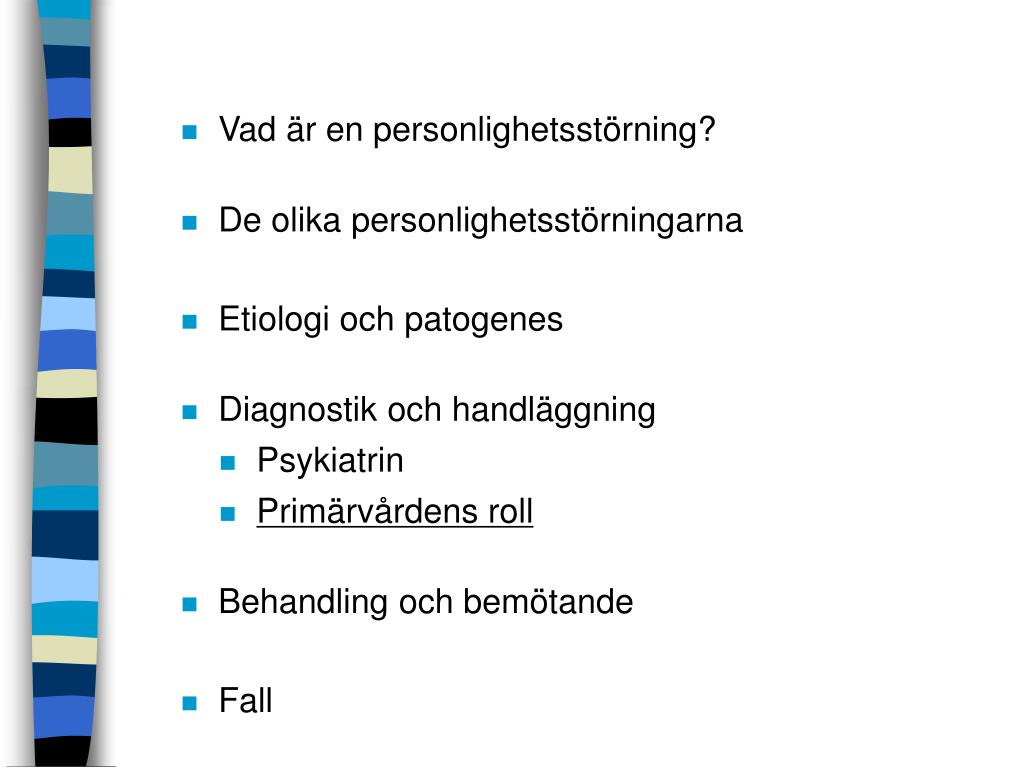 Vad är en personlighetsstörning? • De olika personlighetsstörningarna • Etiologi och patogenes • Diagnostik och handläggning • Psykiatrin • Primärvårdens roll • Behandling och bemötande • Fall