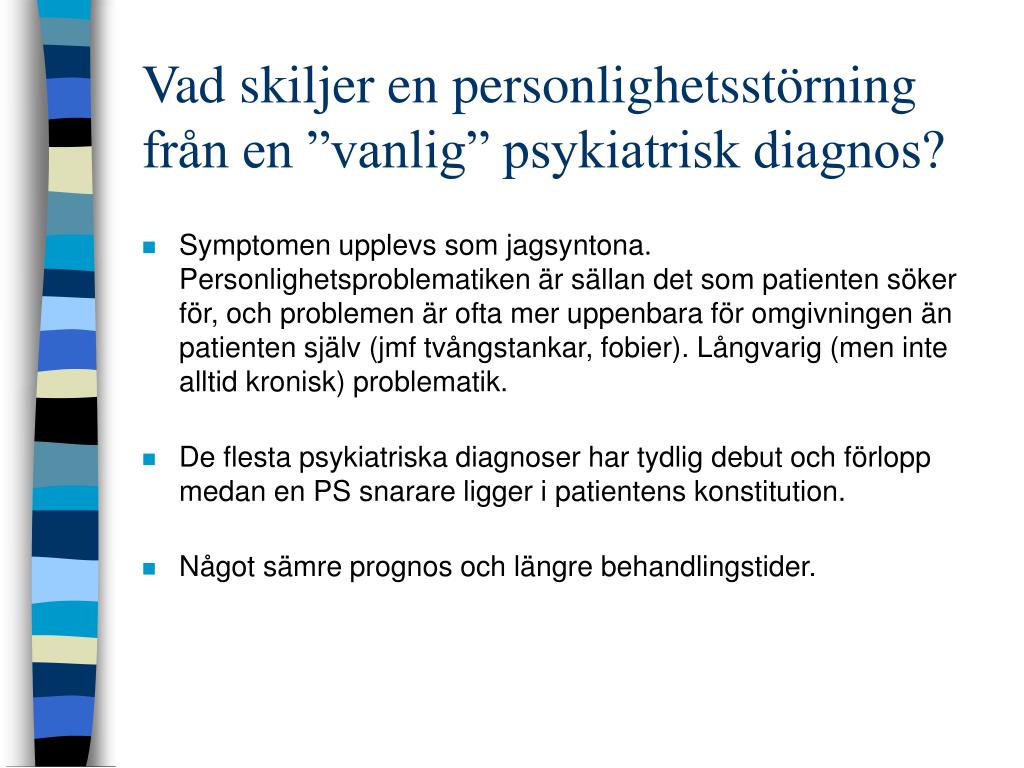 Vad skiljer en personlighetsstörning från en ”vanlig” psykiatrisk diagnos? • Symptomen upplevs som jagsyntona. Personlighetsproblematiken är sällan det som patienten söker för, och problemen är ofta mer uppenbara för omgivningen än patienten själv (jmf tvångstankar, fobier). Långvarig (men inte alltid kronisk) problematik. • De flesta psykiatriska diagnoser har tydlig debut och förlopp medan en PS snarare ligger i patientens konstitution. • Något sämre prognos och längre behandlingstider.
