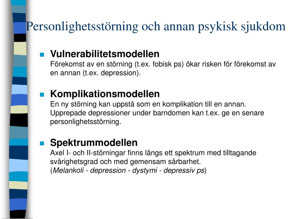 Personlighetsstörning och annan psykisk sjukdom • VulnerabilitetsmodellenFörekomst av en störning (t.ex. fobisk ps) ökar risken för förekomst av en annan (t.ex. depression). • KomplikationsmodellenEn ny störning kan uppstå som en komplikation till en annan. Upprepade depressioner under barndomen kan t.ex. ge en senare personlighetsstörning. • SpektrummodellenAxel I- och II-störningar finns längs ett spektrum med tilltagande svårighetsgrad och med gemensam sårbarhet. (Melankoli - depression - dystymi - depressiv ps)