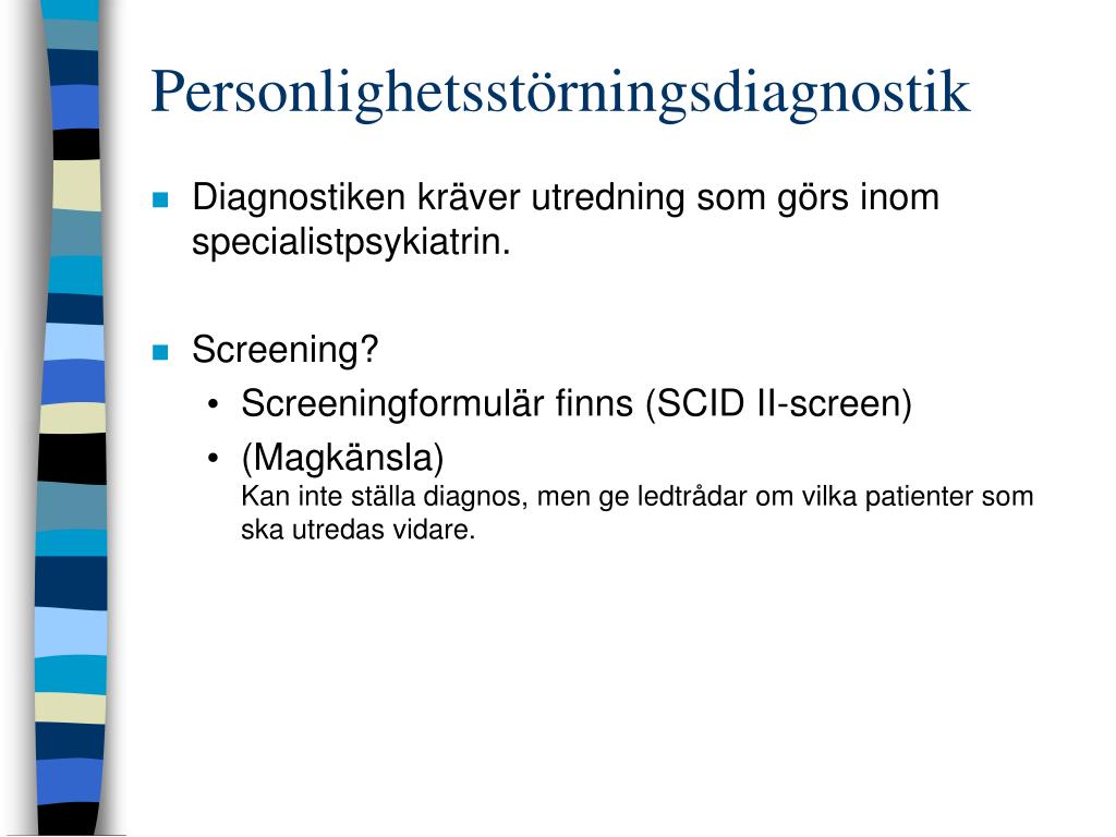 Personlighetsstörningsdiagnostik • Diagnostiken kräver utredning som görs inom specialistpsykiatrin. • Screening? • Screeningformulär finns (SCID II-screen) • (Magkänsla)Kan inte ställa diagnos, men ge ledtrådar om vilka patienter som ska utredas vidare.