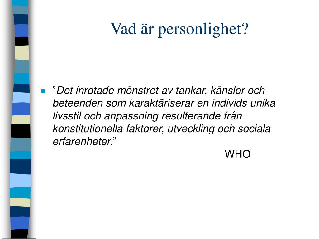 Vad är personlighet? • ”Det inrotade mönstret av tankar, känslor och beteenden som karaktäriserar en individs unika livsstil och anpassning resulterande från konstitutionella faktorer, utveckling och sociala erfarenheter.” WHO