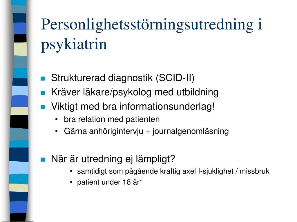 Personlighetsstörningsutredning i psykiatrin • Strukturerad diagnostik (SCID-II) • Kräver läkare/psykolog med utbildning • Viktigt med bra informationsunderlag! • bra relation med patienten • Gärna anhörigintervju + journalgenomläsning • När är utredning ej lämpligt? • samtidigt som pågående kraftig axel I-sjuklighet / missbruk • patient under 18 år*