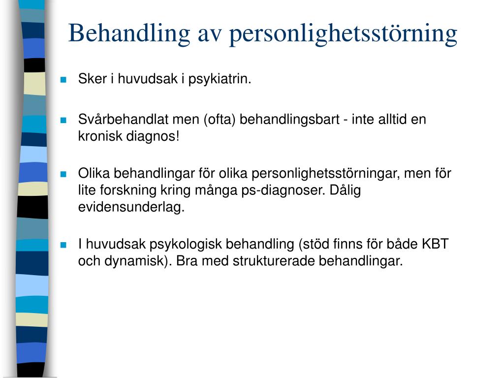 Behandling av personlighetsstörning • Sker i huvudsak i psykiatrin. • Svårbehandlat men (ofta) behandlingsbart - inte alltid en kronisk diagnos! • Olika behandlingar för olika personlighetsstörningar, men för lite forskning kring många ps-diagnoser. Dålig evidensunderlag. • I huvudsak psykologisk behandling (stöd finns för både KBT och dynamisk). Bra med strukturerade behandlingar.