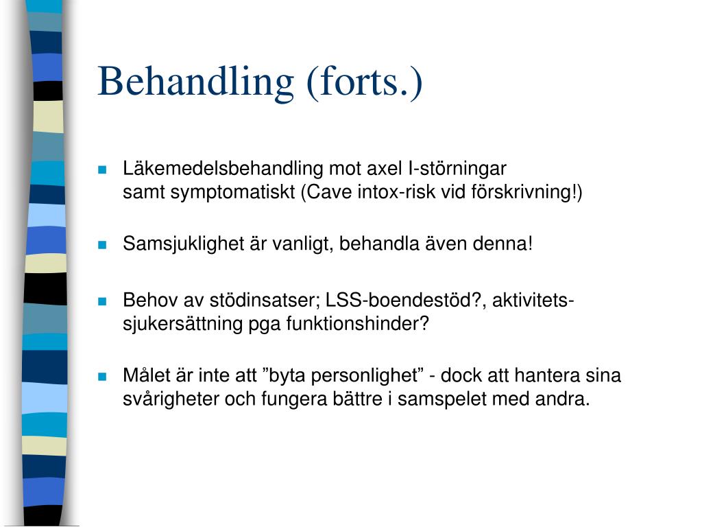 Behandling (forts.) • Läkemedelsbehandling mot axel I-störningarsamt symptomatiskt (Cave intox-risk vid förskrivning!) • Samsjuklighet är vanligt, behandla även denna! • Behov av stödinsatser; LSS-boendestöd?, aktivitets- sjukersättning pga funktionshinder? • Målet är inte att ”byta personlighet” - dock att hantera sina svårigheter och fungera bättre i samspelet med andra.
