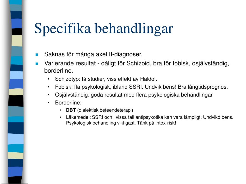 Specifika behandlingar • Saknas för många axel II-diagnoser. • Varierande resultat - dåligt för Schizoid, bra för fobisk, osjälvständig, borderline. • Schizotyp: få studier, viss effekt av Haldol. • Fobisk: ffa psykologisk, ibland SSRI. Undvik bens! Bra långtidsprognos. • Osjälvständig: goda resultat med flera psykologiska behandlingar • Borderline: • DBT (dialektisk beteendeterapi) • Läkemedel: SSRI och i vissa fall antipsykotika kan vara lämpligt. Undvikd bens. Psykologisk behandling viktigast. Tänk på intox-risk!