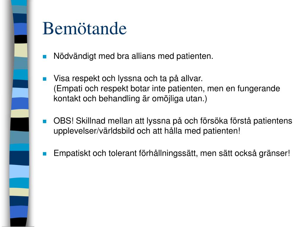 Bemötande • Nödvändigt med bra allians med patienten. • Visa respekt och lyssna och ta på allvar.(Empati och respekt botar inte patienten, men en fungerande kontakt och behandling är omöjliga utan.) • OBS! Skillnad mellan att lyssna på och försöka förstå patientens upplevelser/världsbild och att hålla med patienten! • Empatiskt och tolerant förhållningssätt, men sätt också gränser!