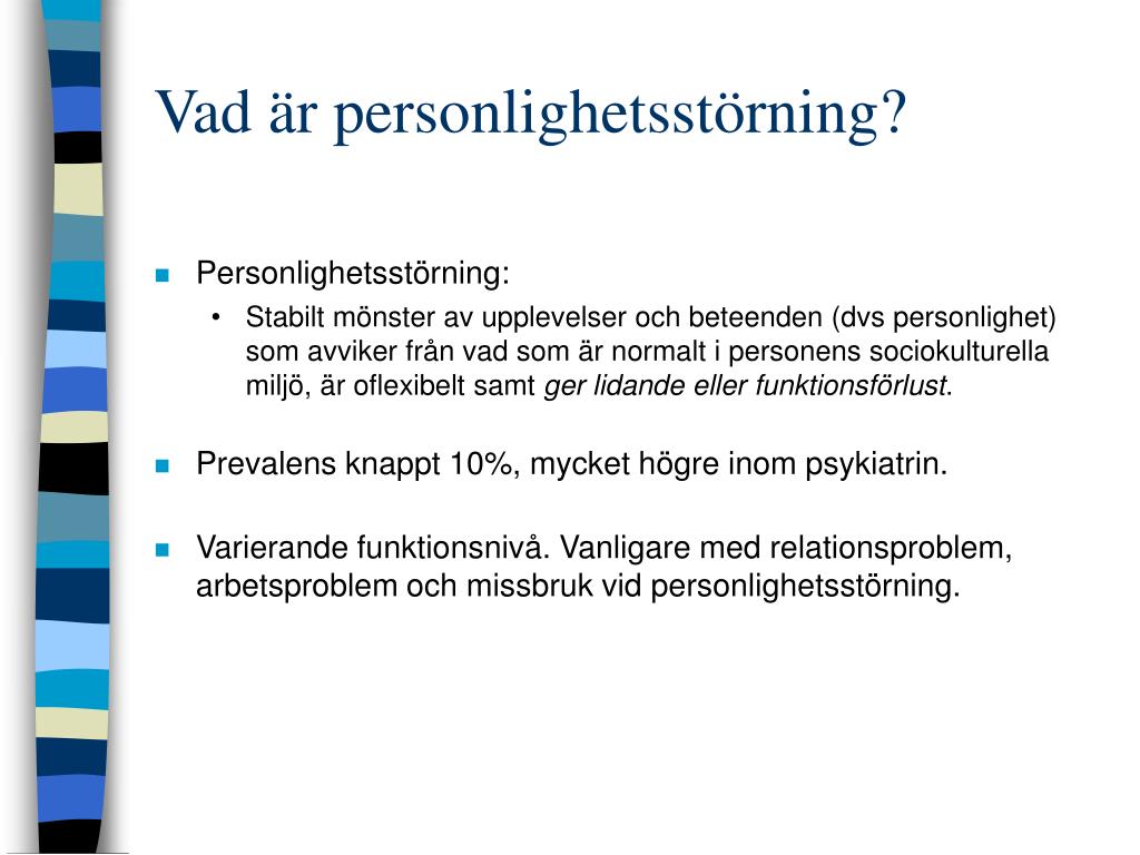Vad är personlighetsstörning? • Personlighetsstörning: • Stabilt mönster av upplevelser och beteenden (dvs personlighet) som avviker från vad som är normalt i personens sociokulturella miljö, är oflexibelt samt ger lidande eller funktionsförlust. • Prevalens knappt 10%, mycket högre inom psykiatrin. • Varierande funktionsnivå. Vanligare med relationsproblem, arbetsproblem och missbruk vid personlighetsstörning.