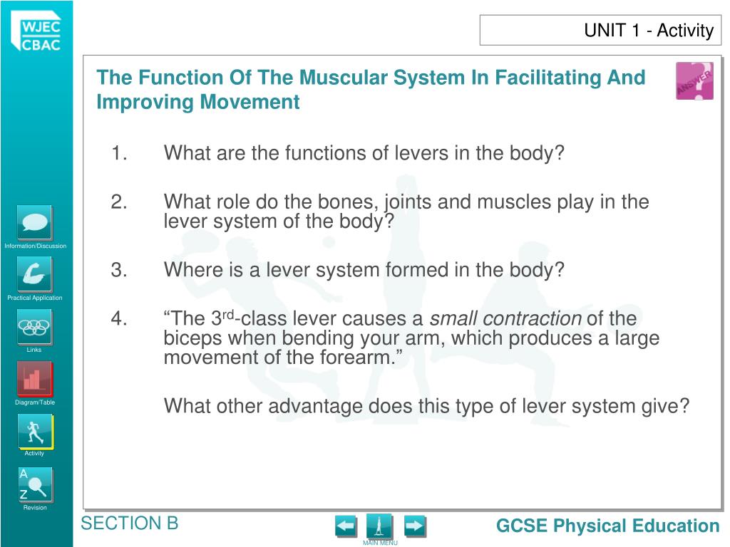 UNIT 1 - Activity • What are the functions of levers in the body? • What role do the bones, joints and muscles play in the lever system of the body? • Where is a lever system formed in the body? • “The 3rd-class lever causes a small contraction of the biceps when bending your arm, which produces a large movement of the forearm.” What other advantage does this type of lever system give?