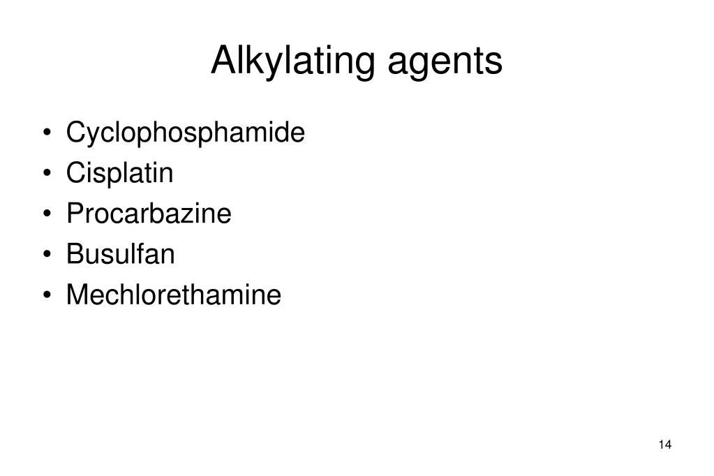 Alkylating agents • Cyclophosphamide • Cisplatin • Procarbazine • Busulfan • Mechlorethamine
