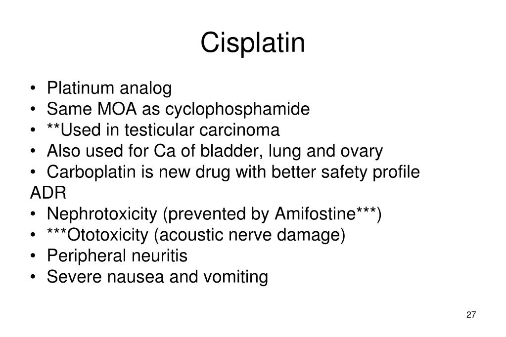 Cisplatin • Platinum analog • Same MOA as cyclophosphamide • **Used in testicular carcinoma • Also used for Ca of bladder, lung and ovary • Carboplatin is new drug with better safety profile ADR • Nephrotoxicity (prevented by Amifostine***) • ***Ototoxicity (acoustic nerve damage) • Peripheral neuritis • Severe nausea and vomiting