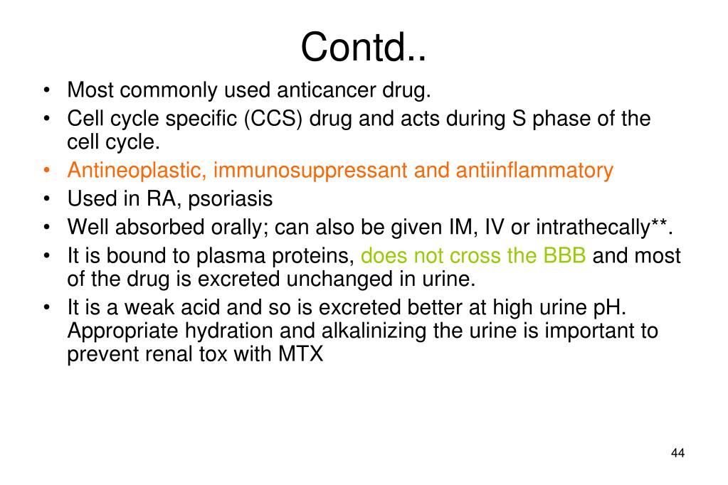 Contd.. • Most commonly used anticancer drug. • Cell cycle specific (CCS) drug and acts during S phase of the cell cycle. • Antineoplastic, immunosuppressant and antiinflammatory • Used in RA, psoriasis • Well absorbed orally; can also be given IM, IV or intrathecally**. • It is bound to plasma proteins, does not cross the BBB and most of the drug is excreted unchanged in urine. • It is a weak acid and so is excreted better at high urine pH. Appropriate hydration and alkalinizing the urine is important to prevent renal tox with MTX
