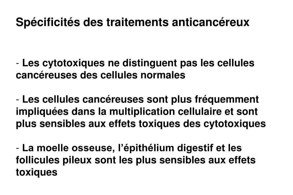 Spécificités des traitements anticancéreux • Les cytotoxiques ne distinguent pas les cellules cancéreuses des cellules normales • Les cellules cancéreuses sont plus fréquemment impliquées dans la multiplication cellulaire et sont plus sensibles aux effets toxiques des cytotoxiques • La moelle osseuse, l’épithélium digestif et les follicules pileux sont les plus sensibles aux effets toxiques