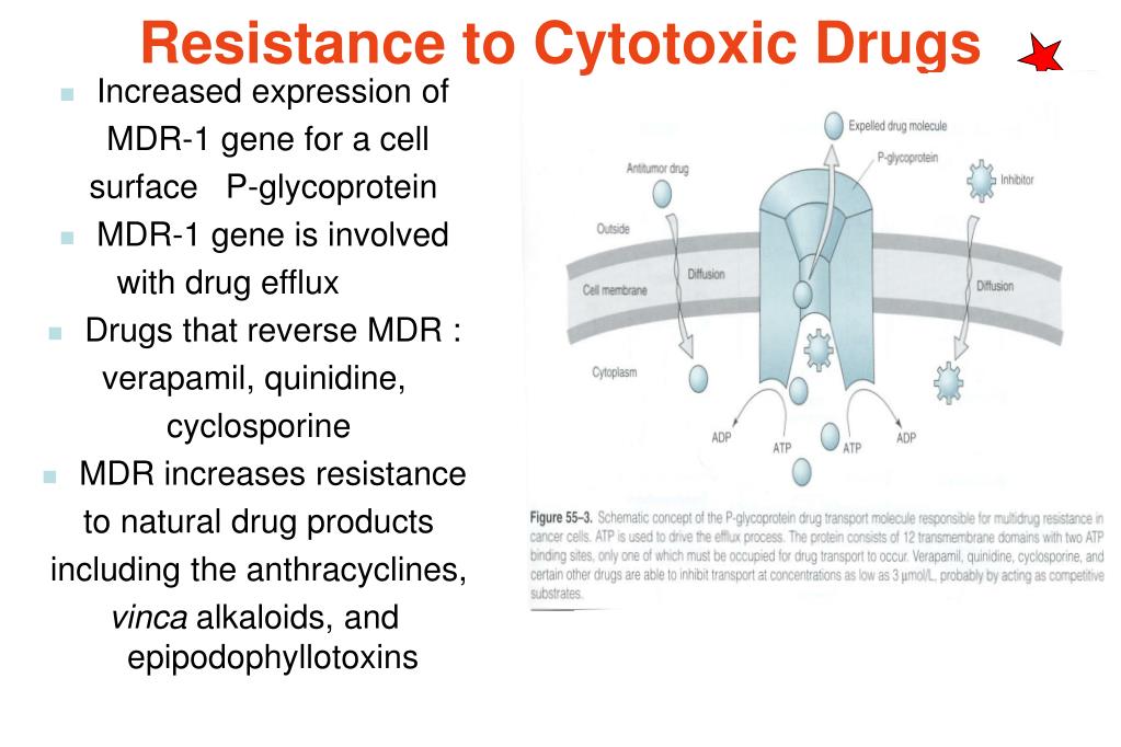 Resistance to Cytotoxic Drugs • Increased expression of MDR-1 gene for a cell surface P-glycoprotein • MDR-1 gene is involved with drug efflux • Drugs that reverse MDR : verapamil, quinidine, cyclosporine • MDR increases resistance to natural drug products including the anthracyclines, vincaalkaloids, and epipodophyllotoxins