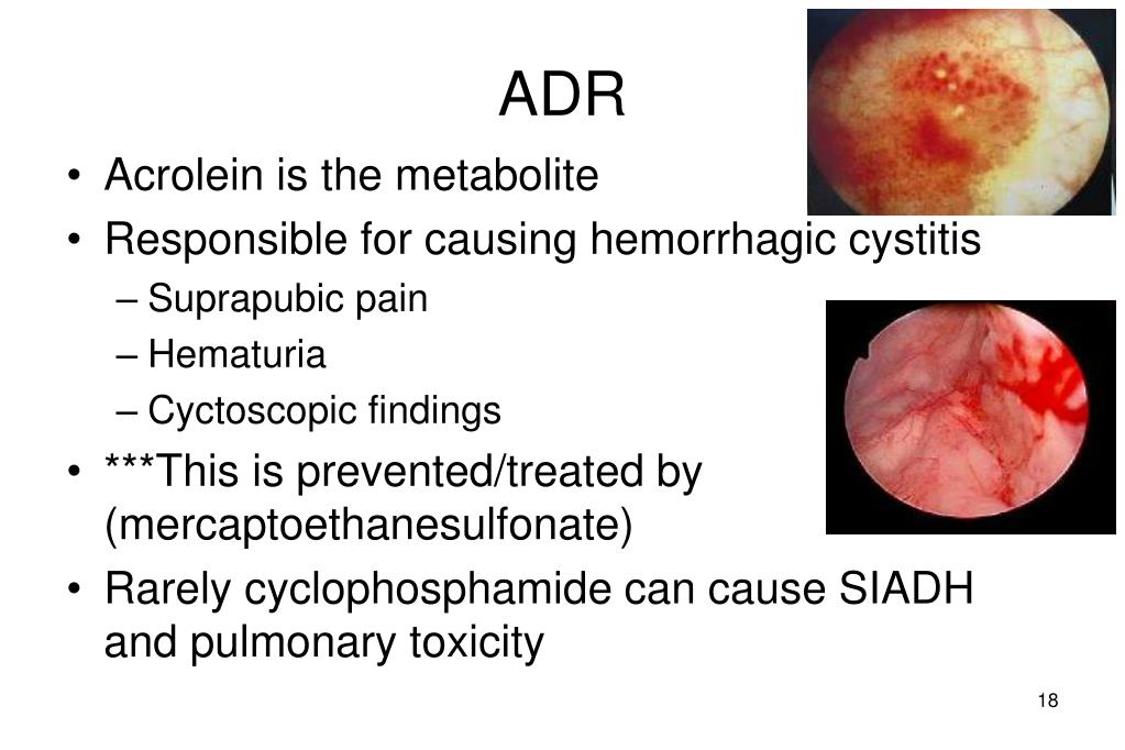 ADR • Acrolein is the metabolite • Responsible for causing hemorrhagic cystitis • Suprapubic pain • Hematuria • Cyctoscopic findings • ***This is prevented/treated by MESNA (mercaptoethanesulfonate) • Rarely cyclophosphamide can cause SIADH and pulmonary toxicity