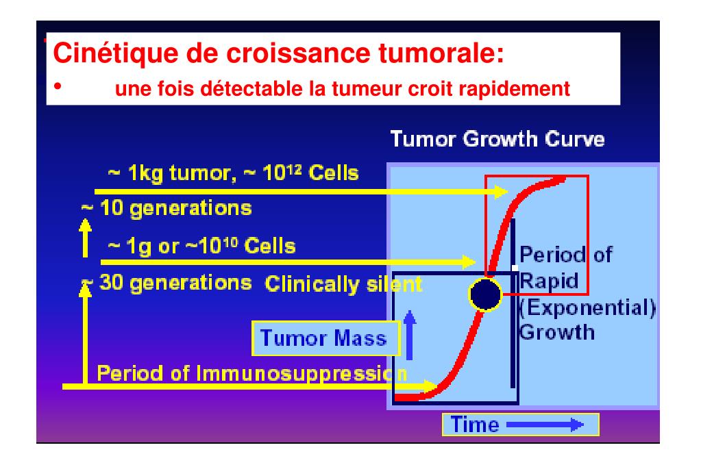 Cinétique de croissance des tumeurs • Une tumeur de 1cm de diamètre contient de 109~ 1010 cellules (30 temps de doublement) • Peut être cliniquement silencieuse dans une masse tissulaire (masse abdominale ou thoracique) • Les 10 temps de doublement suivants amènent la tumeur à une masse de 1kg (1012 cellules)