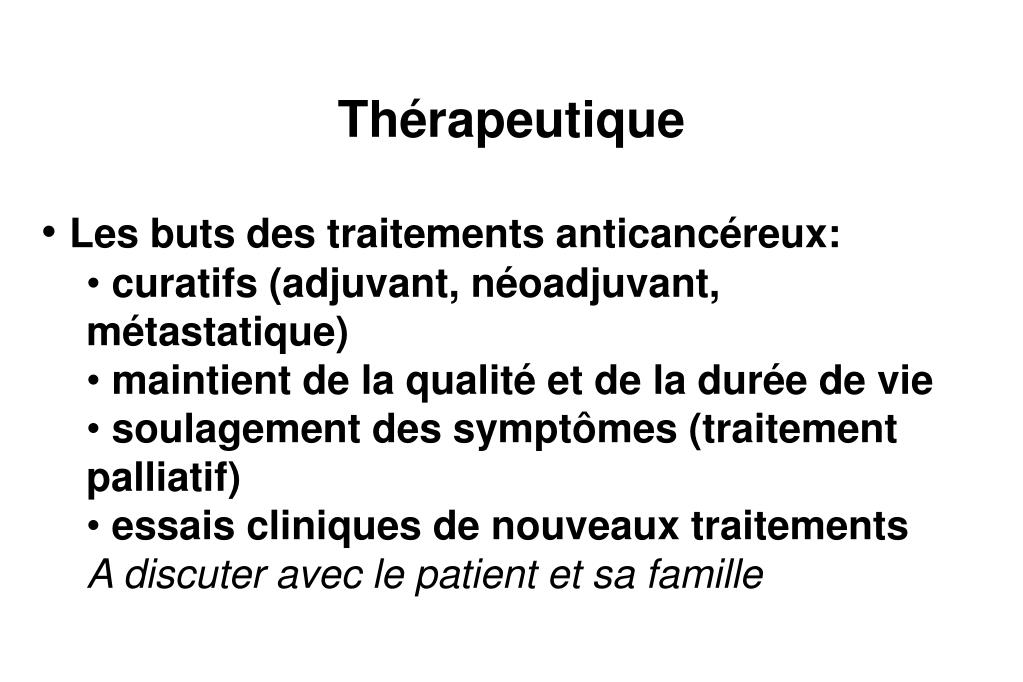 Thérapeutique • Les buts des traitements anticancéreux: • curatifs (adjuvant, néoadjuvant, métastatique) • maintient de la qualité et de la durée de vie • soulagement des symptômes (traitement palliatif) • essais cliniques de nouveaux traitements • A discuter avec le patient et sa famille