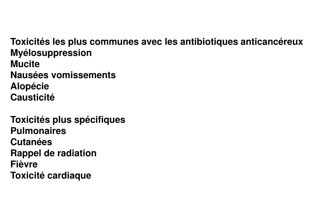Toxicités les plus communes avec les antibiotiques anticancéreux Myélosuppression Mucite Nausées vomissements Alopécie Causticité Toxicités plus spécifiques Pulmonaires Cutanées Rappel de radiation Fièvre Toxicité cardiaque