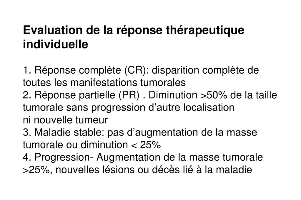 Evaluation de la réponse thérapeutique individuelle 1. Réponse complète (CR): disparition complète de toutes les manifestations tumorales2. Réponse partielle (PR) . Diminution >50% de la taille tumorale sans progression d’autre localisationni nouvelle tumeur3. Maladie stable: pas d’augmentation de la masse tumorale ou diminution < 25% 4. Progression- Augmentation de la masse tumorale >25%, nouvelles lésions ou décès lié à la maladie