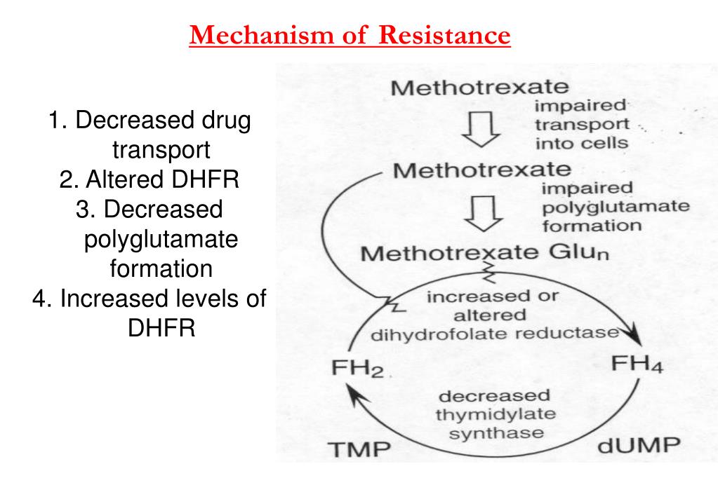 Mechanism of Resistance 1. Decreased drug transport 2. Altered DHFR 3. Decreased polyglutamate formation 4. Increased levels of DHFR