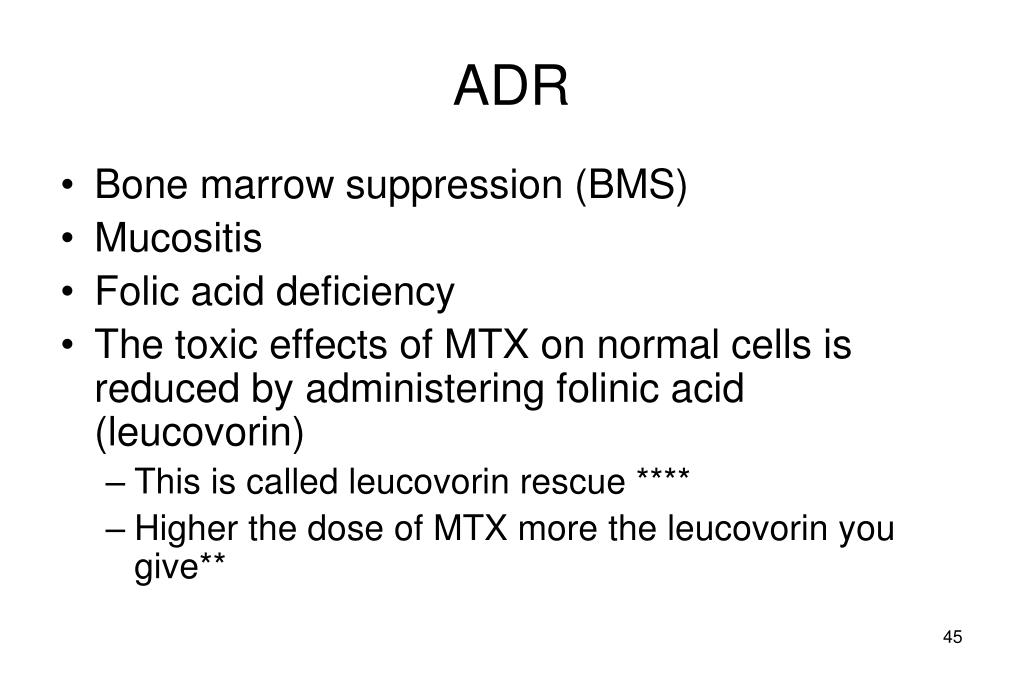 ADR • Bone marrow suppression (BMS) • Mucositis • Folic acid deficiency • The toxic effects of MTX on normal cells is reduced by administering folinic acid (leucovorin) • This is called leucovorin rescue **** • Higher the dose of MTX more the leucovorin you give**