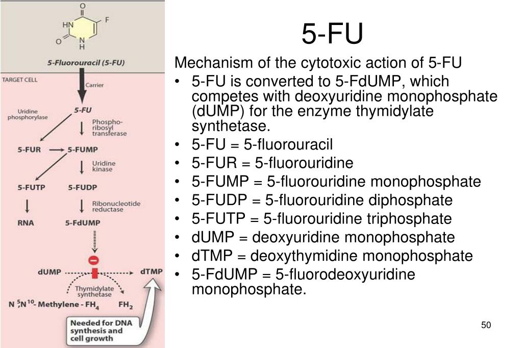 Mechanism of the cytotoxic action of 5-FU 5-FU is converted to 5-FdUMP, which competes with deoxyuridine monophosphate (dUMP) for the enzyme thymidylate synthetase. 5-FU = 5-fluorouracil 5-FUR = 5-fluorouridine 5-FUMP = 5-fluorouridine monophosphate 5-FUDP = 5-fluorouridine diphosphate 5-FUTP = 5-fluorouridine triphosphate dUMP = deoxyuridine monophosphate dTMP = deoxythymidine monophosphate 5-FdUMP = 5-fluorodeoxyuridine monophosphate. 5-FU
