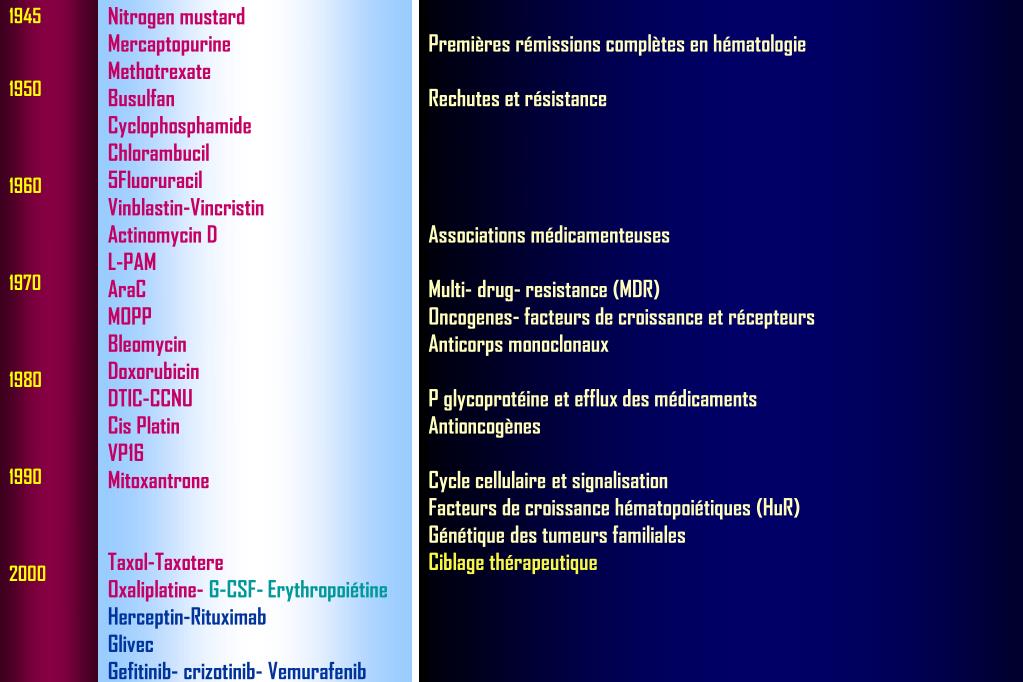 Nitrogenmustard Mercaptopurine Methotrexate Busulfan Cyclophosphamide Chlorambucil 5Fluoruracil Vinblastin-Vincristin Actinomycin D L-PAM AraC MOPP Bleomycin Doxorubicin DTIC-CCNU Cis Platin VP16 Mitoxantrone Taxol-Taxotere Oxaliplatine- G-CSF- Erythropoiétine Herceptin-Rituximab Glivec Gefitinib- crizotinib- Vemurafenib Premières rémissions complètes en hématologie Rechutes et résistance Associations médicamenteuses Multi- drug- resistance (MDR) Oncogenes- facteurs de croissance et récepteurs Anticorps monoclonaux P glycoprotéine et efflux des médicaments Antioncogènes Cycle cellulaire et signalisation Facteurs de croissance hématopoiétiques (HuR) Génétique des tumeurs familiales Ciblage thérapeutique 1945 1950 1960 1970 1980 1990 2000