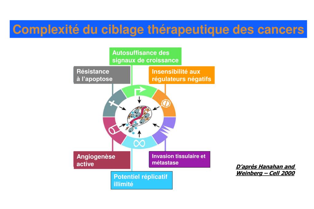 Autosuffisance des signaux de croissance Résistance à l’apoptose Insensibilité aux régulateurs négatifs Angiogenèse active Invasion tissulaire et métastase D’après Hanahan and Weinberg – Cell 2000 Potentiel réplicatif illimité Complexité du ciblage thérapeutique des cancers