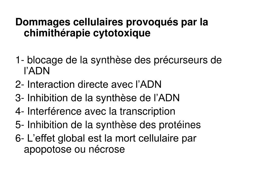Dommages cellulaires provoqués par la chimithérapie cytotoxique 1- blocage de la synthèse des précurseurs de l’ADN 2- Interaction directe avec l’ADN 3- Inhibition de la synthèse de l’ADN 4- Interférence avec la transcription 5- Inhibition de la synthèse des protéines 6- L’effet global est la mort cellulaire par apopotose ou nécrose