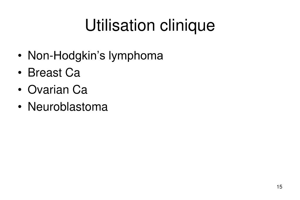 Utilisationclinique • Non-Hodgkin’s lymphoma • Breast Ca • Ovarian Ca • Neuroblastoma