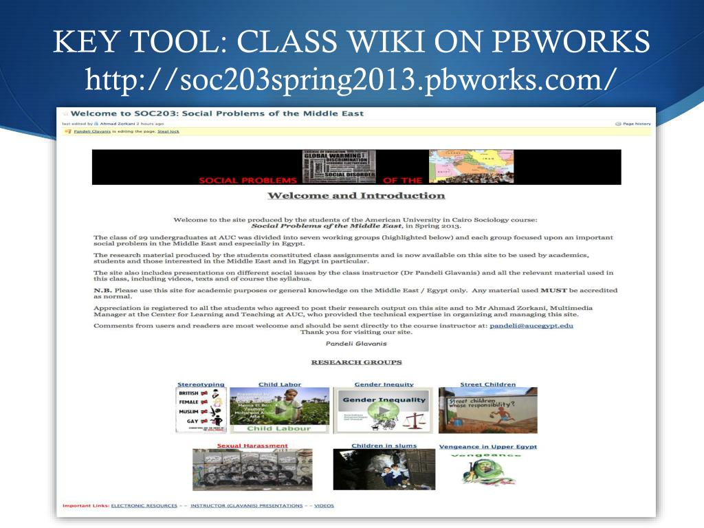 KEY TOOL: CLASS WIKI ON PBWORKShttp://soc203spring2013.pbworks.com/