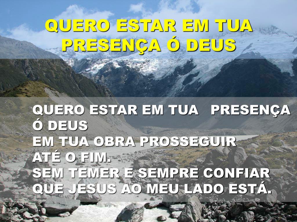 QUERO ESTAR EM TUA PRESENÇA Ó DEUS QUERO ESTAR EM TUA PRESENÇA Ó DEUS EM TUA OBRA PROSSEGUIR ATÉ O FIM. SEM TEMER E SEMPRE CONFIAR QUE JESUS AO MEU LADO ESTÁ.