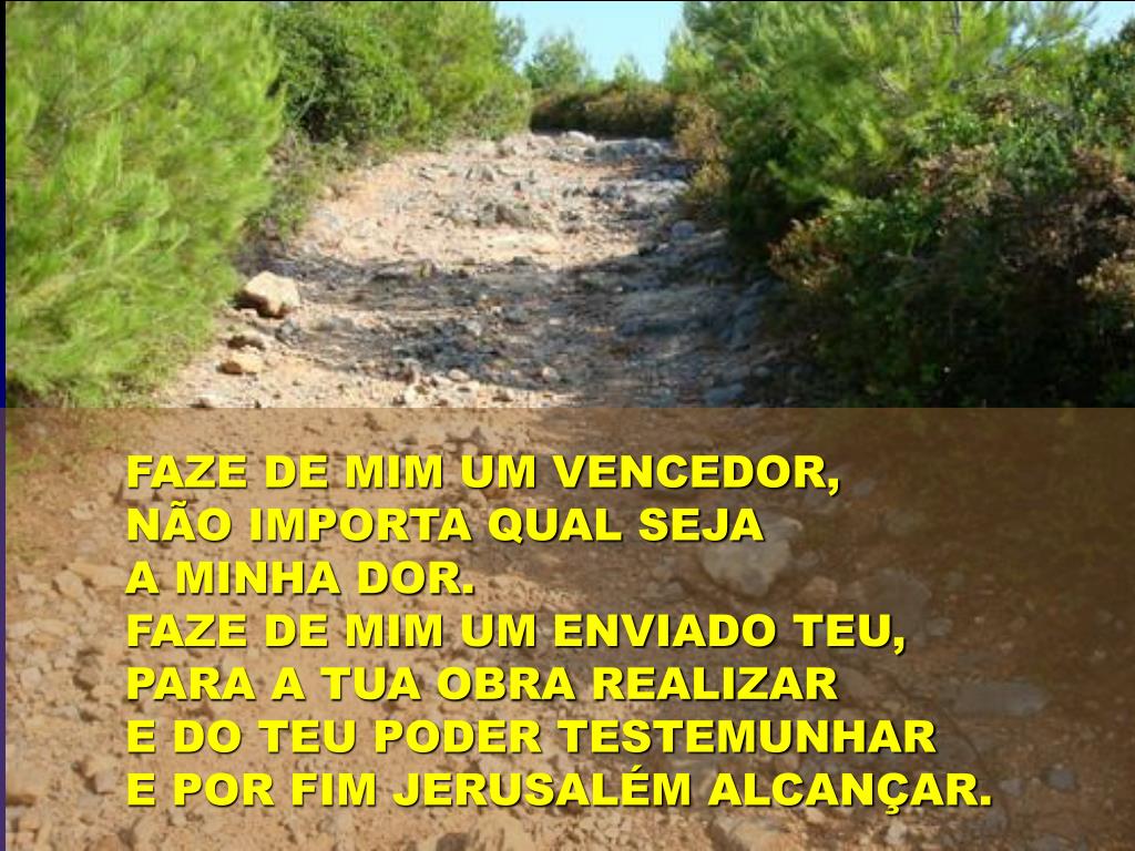 FAZE DE MIM UM VENCEDOR, NÃO IMPORTA QUAL SEJA A MINHA DOR. FAZE DE MIM UM ENVIADO TEU, PARA A TUA OBRA REALIZAR E DO TEU PODER TESTEMUNHAR E POR FIM JERUSALÉM ALCANÇAR.