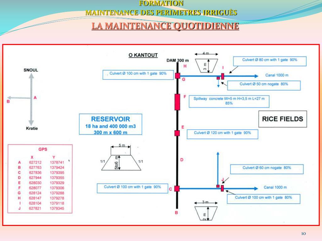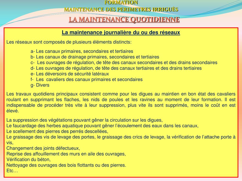 FORMATION MAINTENANCE DES PERIMETRES IRRIGUÈS LA MAINTENANCE QUOTIDIENNE La maintenance journalière du ou des réseaux Les réseaux sont composés de plusieurs éléments distincts: a- Les canaux primaires, secondaires et tertiaires b- Les canaux de drainage primaires, secondaires et tertiaires c- Les ouvrages de régulation, de tête des canaux secondaires et des drains secondaires d- Les ouvrages de régulation, de tête des canaux tertiaires et des drains tertiaires e- Les déversoirs de sécurité latéraux f- Les cavaliers des canaux primaires et secondaires g- Divers Les travaux quotidiens principaux consistent comme pour les digues au maintien en bon état des cavaliers roulant en supprimant les flaches, les nids de poules et les ravines au moment de leur formation. Il est indispensable de procéder très vite à leur suppression, plus vite ils sont supprimés, moins le coût en est élevé. La suppression des végétations pouvant gêner la circulation sur les digues, Le faucardage des herbes aquatique pouvant gêner l’écoulement des eaux dans les canaux, Le scellement des pierres des perrés descellées, Le graissage des vis de levage des portes, le graissage des crics de levage, la vérification de l’attache porte à vis, Changement des joints défectueux, Reprise des affouillement des murs en aile des ouvrages, Vérification du béton, Nettoyage des ouvrages des bois flottants ou des pierres. Etc…