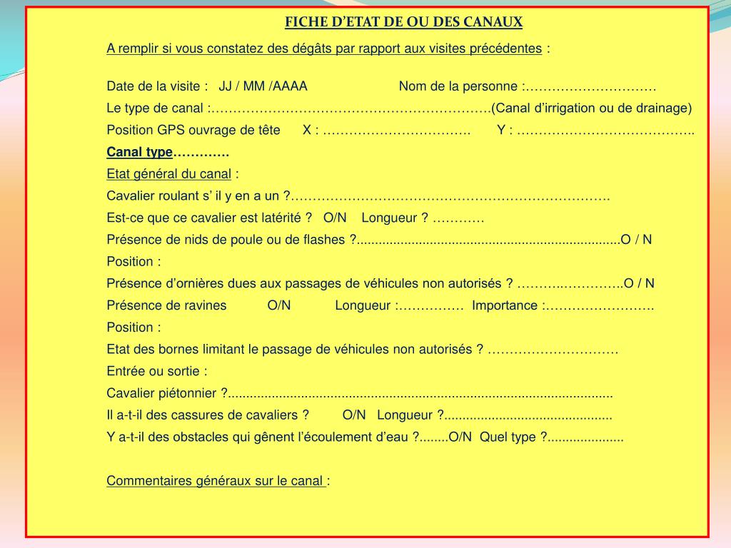 FICHE D’ETAT DE OU DES CANAUX A remplir si vous constatez des dégâts par rapport aux visites précédentes : Date de la visite : JJ / MM /AAAA Nom de la personne :………………………… Le type de canal :……………………………………………………….(Canal d’irrigation ou de drainage) Position GPS ouvrage de tête X : ……………………………. Y : ………………………………….. Canal type…………. Etat général du canal : Cavalier roulant s’ il y en a un ?………………………………………………………………. Est-ce que ce cavalier est latérité ? O/N Longueur ? ………… Présence de nids de poule ou de flashes ?........................................................................O / N Position : Présence d’ornières dues aux passages de véhicules non autorisés ? ………..…………..O / N Présence de ravines O/N Longueur :…………… Importance :……………………. Position : Etat des bornes limitant le passage de véhicules non autorisés ? ………………………… Entrée ou sortie : Cavalier piétonnier ?......................................................................................................... Il a-t-il des cassures de cavaliers ? O/N Longueur ?.............................................. Y a-t-il des obstacles qui gênent l’écoulement d’eau ?........O/N Quel type ?..................... Commentaires généraux sur le canal :