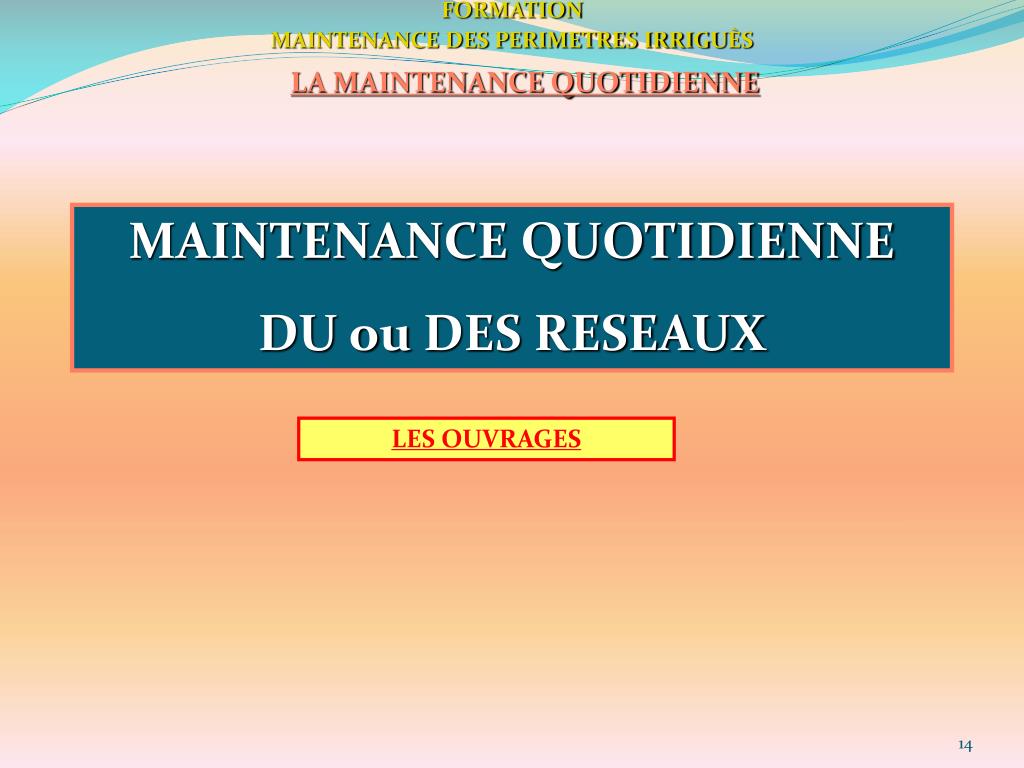FORMATION MAINTENANCE DES PERIMETRES IRRIGUÈS LA MAINTENANCE QUOTIDIENNE MAINTENANCE QUOTIDIENNE DU ou DES RESEAUX LES OUVRAGES