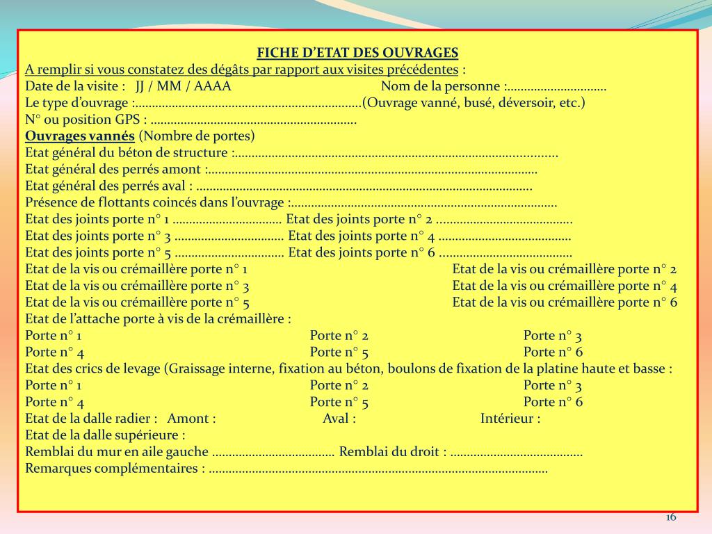 FICHE D’ETAT DES OUVRAGES A remplir si vous constatez des dégâts par rapport aux visites précédentes : Date de la visite : JJ / MM / AAAA Nom de la personne :………………………… Le type d’ouvrage :…………………………………………………………..(Ouvrage vanné, busé, déversoir, etc.) N° ou position GPS : …………………………………………………….. Ouvrages vannés (Nombre de portes) Etat général du béton de structure :………………………………………………………………………............... Etat général des perrés amont :……………………………………………………………………………………… Etat général des perrés aval : ……………………………………………………………………………………….. Présence de flottants coincés dans l’ouvrage :…………………………………………………………………….. Etat des joints porte n° 1 …………………………… Etat des joints porte n° 2 ...……………………………….. Etat des joints porte n° 3 …………………………… Etat des joints porte n° 4 …………………………………. Etat des joints porte n° 5 …………………………… Etat des joints porte n° 6 ...………………………………. Etat de la vis ou crémaillère porte n° 1 Etat de la vis ou crémaillère porte n° 2 Etat de la vis ou crémaillère porte n° 3 Etat de la vis ou crémaillère porte n° 4 Etat de la vis ou crémaillère porte n° 5 Etat de la vis ou crémaillère porte n° 6 Etat de l’attache porte à vis de la crémaillère : Porte n° 1 Porte n° 2 Porte n° 3 Porte n° 4 Porte n° 5 Porte n° 6 Etat des crics de levage (Graissage interne, fixation au béton, boulons de fixation de la platine haute et basse : Porte n° 1 Porte n° 2 Porte n° 3 Porte n° 4 Porte n° 5 Porte n° 6 Etat de la dalle radier : Amont : Aval : Intérieur : Etat de la dalle supérieure : Remblai du mur en aile gauche ………………………………. Remblai du droit : …………………………………. Remarques complémentaires : …………………………………………………………………………………………