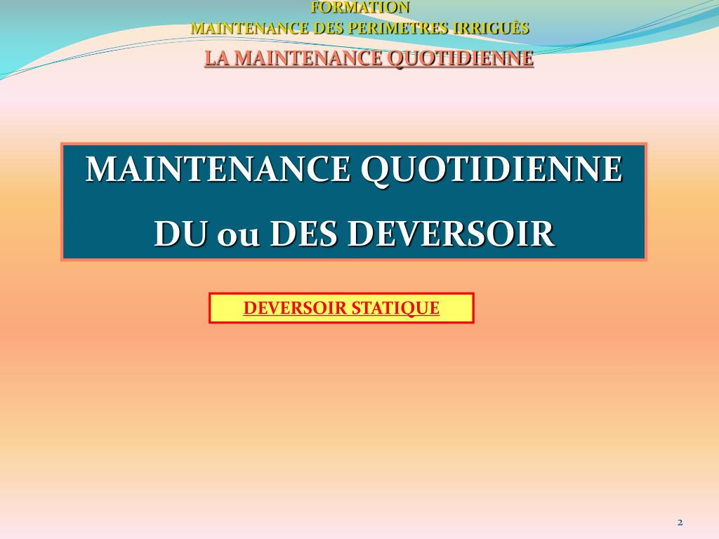 FORMATION MAINTENANCE DES PERIMETRES IRRIGUÈS LA MAINTENANCE QUOTIDIENNE MAINTENANCE QUOTIDIENNE DU ou DES DEVERSOIR DEVERSOIR STATIQUE