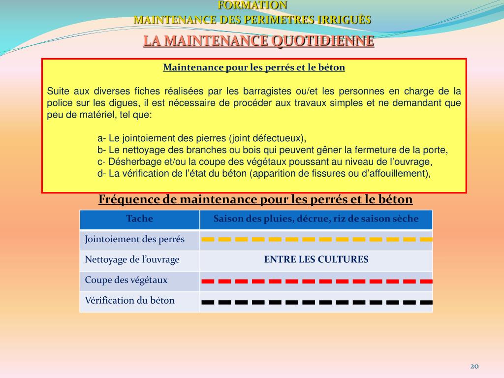 FORMATION MAINTENANCE DES PERIMETRES IRRIGUÈS LA MAINTENANCE QUOTIDIENNE Maintenance pour les perrés et le béton Suite aux diverses fiches réalisées par les barragistes ou/et les personnes en charge de la police sur les digues, il est nécessaire de procéder aux travaux simples et ne demandant que peu de matériel, tel que: a- Le jointoiement des pierres (joint défectueux), b- Le nettoyage des branches ou bois qui peuvent gêner la fermeture de la porte, c- Désherbage et/ou la coupe des végétaux poussant au niveau de l’ouvrage, d- La vérification de l’état du béton (apparition de fissures ou d’affouillement), Fréquence de maintenance pour les perrés et le béton