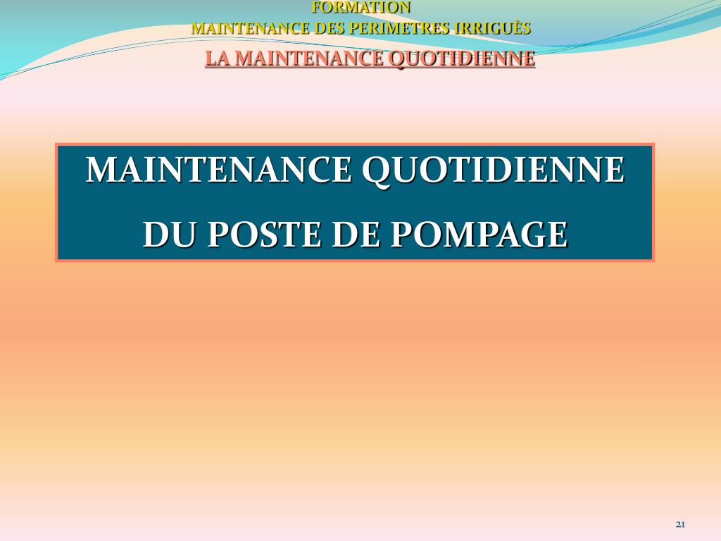 FORMATION MAINTENANCE DES PERIMETRES IRRIGUÈS LA MAINTENANCE QUOTIDIENNE MAINTENANCE QUOTIDIENNE DU POSTE DE POMPAGE