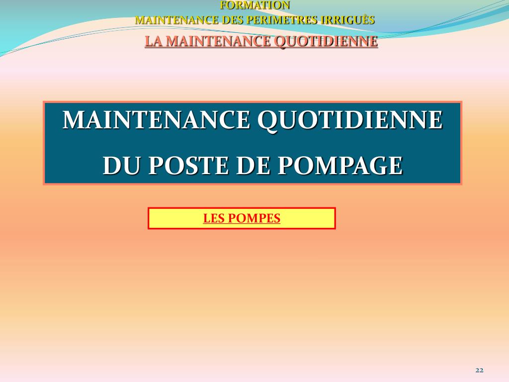 FORMATION MAINTENANCE DES PERIMETRES IRRIGUÈS LA MAINTENANCE QUOTIDIENNE MAINTENANCE QUOTIDIENNE DU POSTE DE POMPAGE LES POMPES
