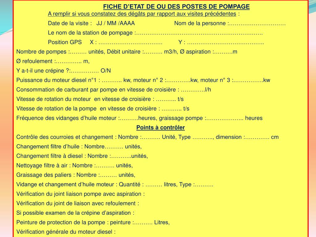 FICHE D’ETAT DE OU DES POSTES DE POMPAGE A remplir si vous constatez des dégâts par rapport aux visites précédentes : Date de la visite : JJ / MM /AAAA Nom de la personne :………………………… Le nom de la station de pompage :…………………………………………………………. Position GPS X : ……………………………. Y : ………………………………….. Nombre de pompes :……… unités, Débit unitaire :………. m3/h, Ø aspiration :……….m Ø refoulement :………….. m, Y a-t-il une crépine ?:…………… O/N Puissance du moteur diesel n°1 : ……….. kw, moteur n° 2 :………….kw, moteur n° 3 :…………….kw Consommation de carburant par pompe en vitesse de croisière : ………….l/h Vitesse de rotation du moteur en vitesse de croisière : ……….. t/s Vitesse de rotation de la pompe en vitesse de croisière : ……….. t/s Fréquence des vidanges d’huile moteur :……….heures, graissage pompe :……………….. heures Points à contrôler Contrôle des courroies et changement : Nombre :………. Unité, Type ……….., dimension :…………. cm Changement filtre d’huile : Nombre………. unités, Changement filtre à diesel : Nombre :………..unités, Nettoyage filtre à air : Nombre :………. unités, Graissage des paliers : Nombre :……… unités, Vidange et changement d’huile moteur : Quantité : ……… litres, Type :………. Vérification du joint liaison pompe avec aspiration : Vérification du joint de liaison avec refoulement : Si possible examen de la crépine d’aspiration : Peinture de protection de la pompe : peinture :………. Litres, Vérification générale du moteur diesel :