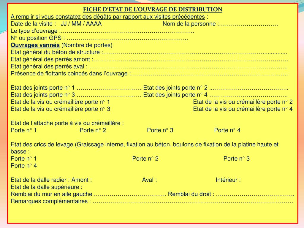 FICHE D’ETAT DE L’OUVRAGE DE DISTRIBUTION A remplir si vous constatez des dégâts par rapport aux visites précédentes : Date de la visite : JJ / MM / AAAA Nom de la personne :………………………… Le type d’ouvrage :………………………………………………………….. N° ou position GPS : …………………………………………………….. Ouvrages vannés (Nombre de portes) Etat général du béton de structure :………………………………………………………………………............... Etat général des perrés amont :……………………………………………………………………………………… Etat général des perrés aval : ……………………………………………………………………………………….. Présence de flottants coincés dans l’ouvrage :…………………………………………………………………….. Etat des joints porte n° 1 …………………………… Etat des joints porte n° 2 ...……………………………….. Etat des joints porte n° 3 …………………………… Etat des joints porte n° 4 …………………………………. Etat de la vis ou crémaillère porte n° 1 Etat de la vis ou crémaillère porte n° 2 Etat de la vis ou crémaillère porte n° 3 Etat de la vis ou crémaillère porte n° 4 Etat de l’attache porte à vis ou crémaillère : Porte n° 1 Porte n° 2 Porte n° 3 Porte n° 4 Etat des crics de levage (Graissage interne, fixation au béton, boulons de fixation de la platine haute et basse : Porte n° 1 Porte n° 2 Porte n° 3 Porte n° 4 Etat de la dalle radier : Amont : Aval : Intérieur : Etat de la dalle supérieure : Remblai du mur en aile gauche ………………………………. Remblai du droit : …………………………………. Remarques complémentaires : …………………………………………………………………………………………