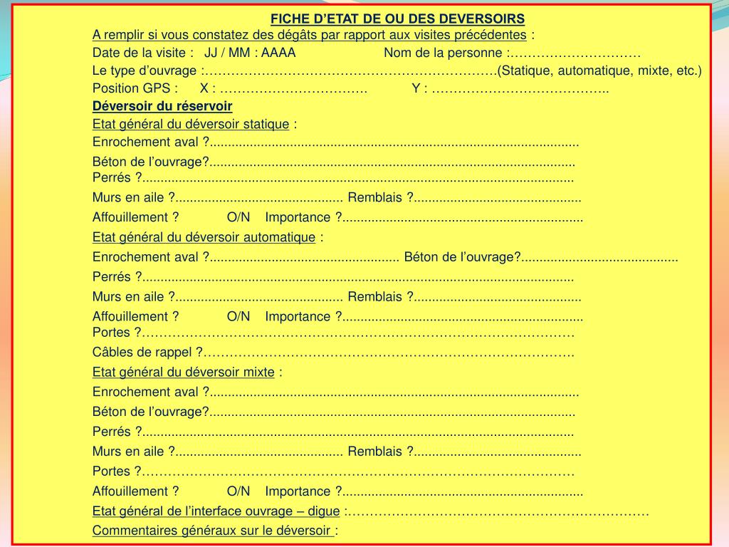 FICHE D’ETAT DE OU DES DEVERSOIRS A remplir si vous constatez des dégâts par rapport aux visites précédentes : Date de la visite : JJ / MM : AAAA Nom de la personne :………………………… Le type d’ouvrage :………………………………………………………….(Statique, automatique, mixte, etc.) Position GPS : X : ……………………………. Y : ………………………………….. Déversoir du réservoir Etat général du déversoir statique : Enrochement aval ?..................................................................................................... Béton de l’ouvrage?.................................................................................................... Perrés ?...................................................................................................................... Murs en aile ?.............................................. Remblais ?.............................................. Affouillement ? O/N Importance ?.................................................................. Etat général du déversoir automatique : Enrochement aval ?.................................................... Béton de l’ouvrage?........................................... Perrés ?...................................................................................................................... Murs en aile ?.............................................. Remblais ?.............................................. Affouillement ? O/N Importance ?.................................................................. Portes ?……………………………………………………………………………………… Câbles de rappel ?…………………………………………………………………………. Etat général du déversoir mixte : Enrochement aval ?..................................................................................................... Béton de l’ouvrage?.................................................................................................... Perrés ?...................................................................................................................... Murs en aile ?.............................................. Remblais ?.............................................. Portes ?……………………………………………………………………………………… Affouillement ? O/N Importance ?.................................................................. Etat général de l’interface ouvrage – digue :…………………………………………………………… Commentaires généraux sur le déversoir :