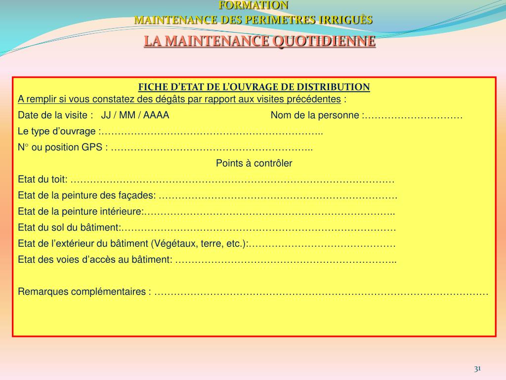 FORMATION MAINTENANCE DES PERIMETRES IRRIGUÈS LA MAINTENANCE QUOTIDIENNE FICHE D’ETAT DE L’OUVRAGE DE DISTRIBUTION A remplir si vous constatez des dégâts par rapport aux visites précédentes : Date de la visite : JJ / MM / AAAA Nom de la personne :………………………… Le type d’ouvrage :………………………………………………………….. N° ou position GPS : …………………………………………………….. Points à contrôler Etat du toit: ……………………………………………………………………………………… Etat de la peinture des façades: ………………………………………………………………. Etat de la peinture intérieure:………………………………………………………………….. Etat du sol du bâtiment:………………………………………………………………………… Etat de l’extérieur du bâtiment (Végétaux, terre, etc.):……………………………………… Etat des voies d’accès au bâtiment: ………………………………………………………….. Remarques complémentaires : …………………………………………………………………………………………