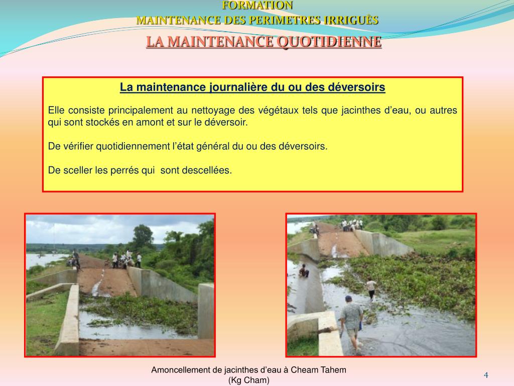 FORMATION MAINTENANCE DES PERIMETRES IRRIGUÈS LA MAINTENANCE QUOTIDIENNE La maintenance journalière du ou des déversoirs Elle consiste principalement au nettoyage des végétaux tels que jacinthes d’eau, ou autres qui sont stockés en amont et sur le déversoir. De vérifier quotidiennement l’état général du ou des déversoirs. De sceller les perrés qui sont descellées. Amoncellement de jacinthes d’eau à CheamTahem (Kg Cham)