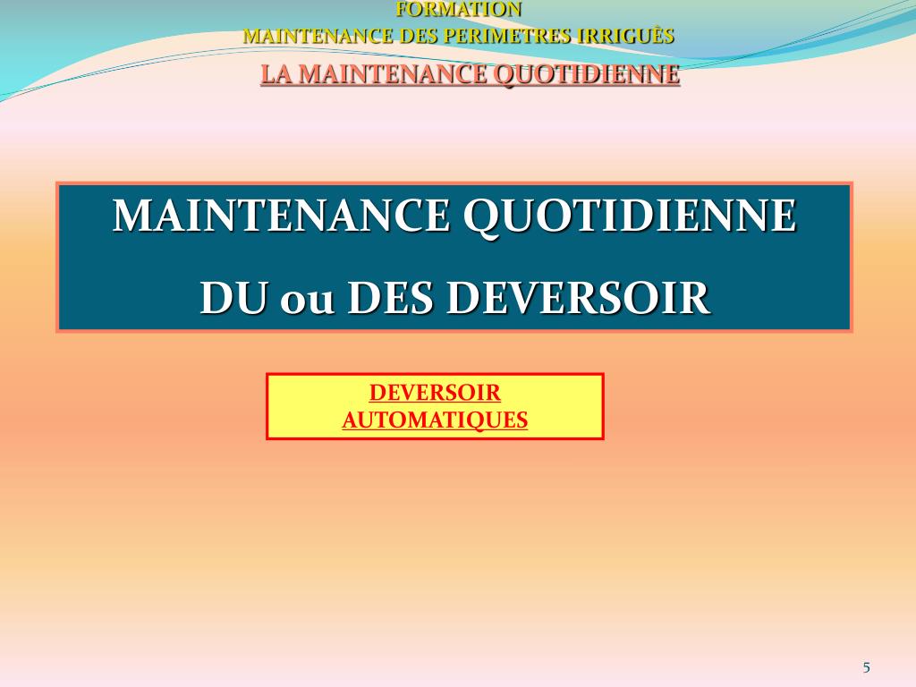 FORMATION MAINTENANCE DES PERIMETRES IRRIGUÈS LA MAINTENANCE QUOTIDIENNE MAINTENANCE QUOTIDIENNE DU ou DES DEVERSOIR DEVERSOIR AUTOMATIQUES